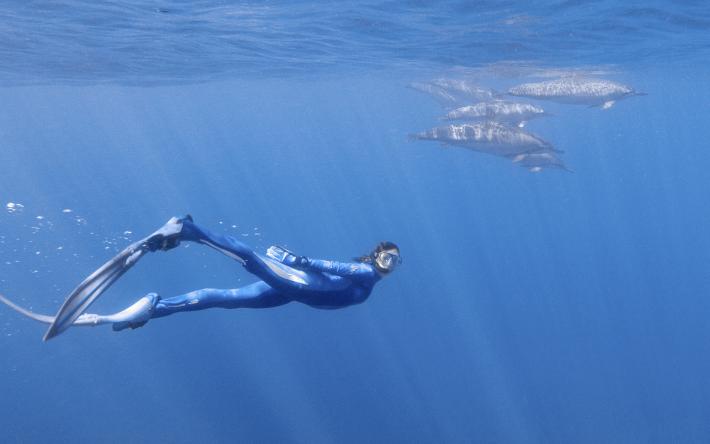 Céline Cousteau swims with spinner dolphins. Hawaiian Islands Humpback Whale NMS. © Carrie Vonderhaar, Ocean Futures Society -