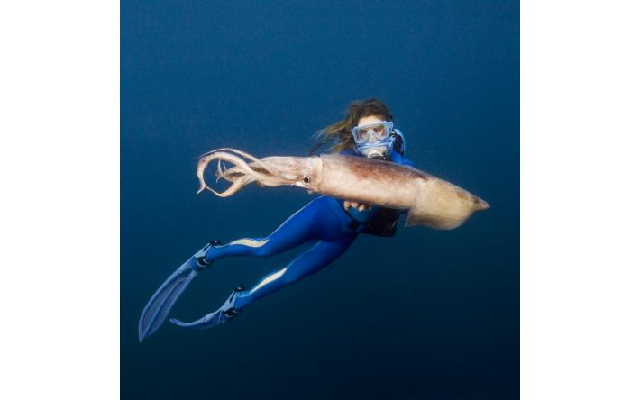 Holly Lohuis swims with one of the sea’s beautiful demons, a Humboldt squid. © Carrie Vonderhaar, Ocean Futures Society -